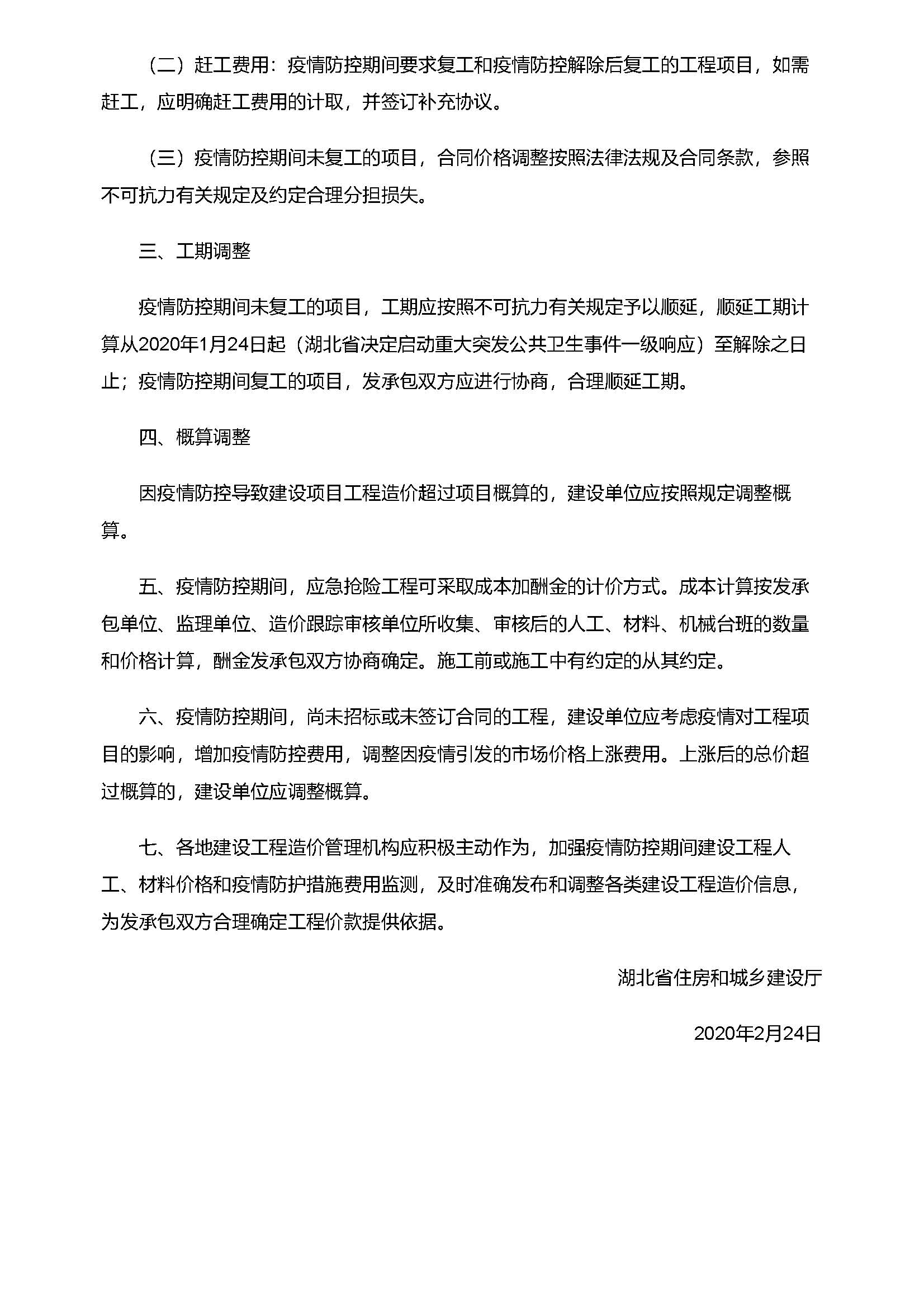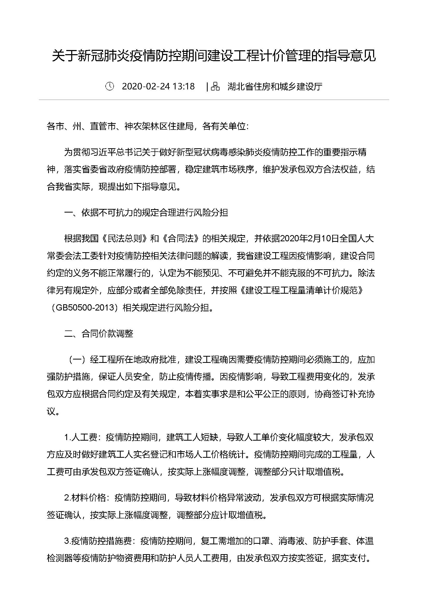 湖北省住房和城乡建设厅关于新冠肺炎疫情防控期间建设工程计价管理的指导意见