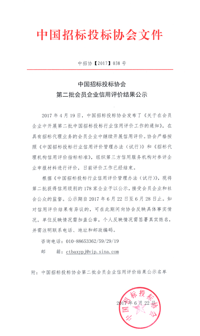 中国招标投标协会第二批会员企业信用评价结果公示